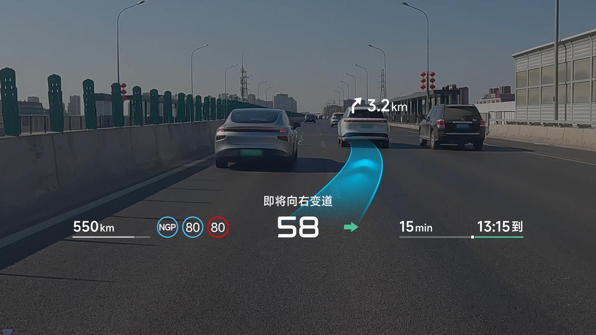 智能交互上,87 英寸追光全景抬头显示、15.6 英寸中控屏 + 8 英寸二排屏 + 9 英寸流媒体内后视镜的组合,构建起多维度的智能交互空间。其中,87 英寸追光全景抬头显示拥有 1800:1 对比度和 12000nit 高亮度,全天候高清显示,解决了传统 HUD 看不清、易眩晕、遮挡视线的痛点,还具备 AR 车道级导航、AR 辅助驾驶、AR 安全辅助等强大功能。