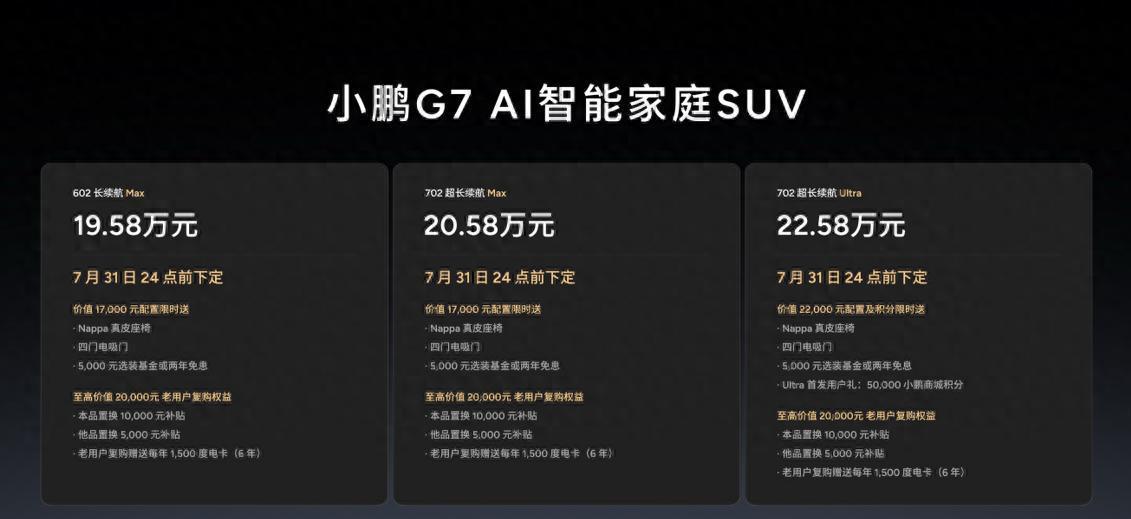 2025 年7月3日,小鹏全新车型—— G7 正式上市。新车共推出三个版本,价格分别为:602 长续航 Max 19.58 万元、702 超长续航 Max 20.58 万元、702 超长续航 Ultra 22.58 万元。除了惊喜的上市价格外,小鹏 G7 还推出了丰厚的上市政策权益,进一步降低了拥车成本。