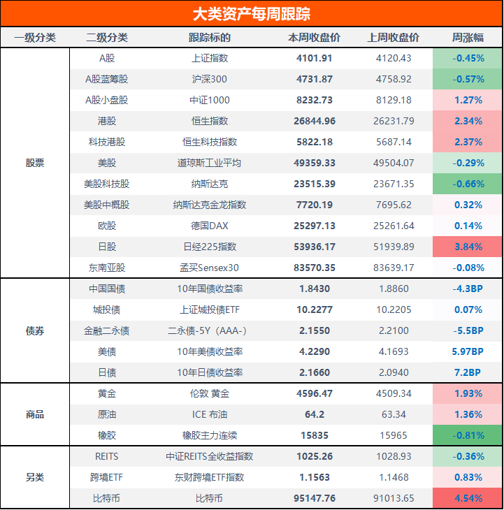 本周,债市收益率整体先上后下,主要受央行公布12月买债操作、公募基金销售新规落地及股债跷跷板情绪等影响。10年期国债收益率下行4.3BP,10Y美债收益率上行5.97BP。