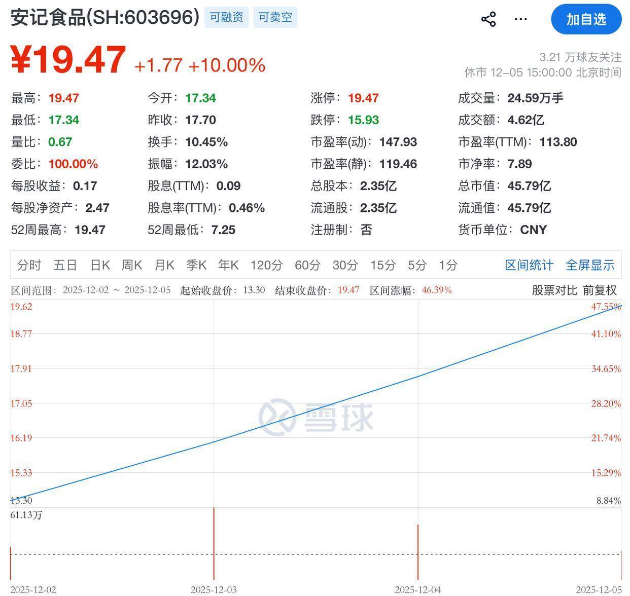 截至12月5日收盘,安记食品报收19.47元/股,创下自2018年7月16日以来的新高,公司市值也升至45.79亿元。